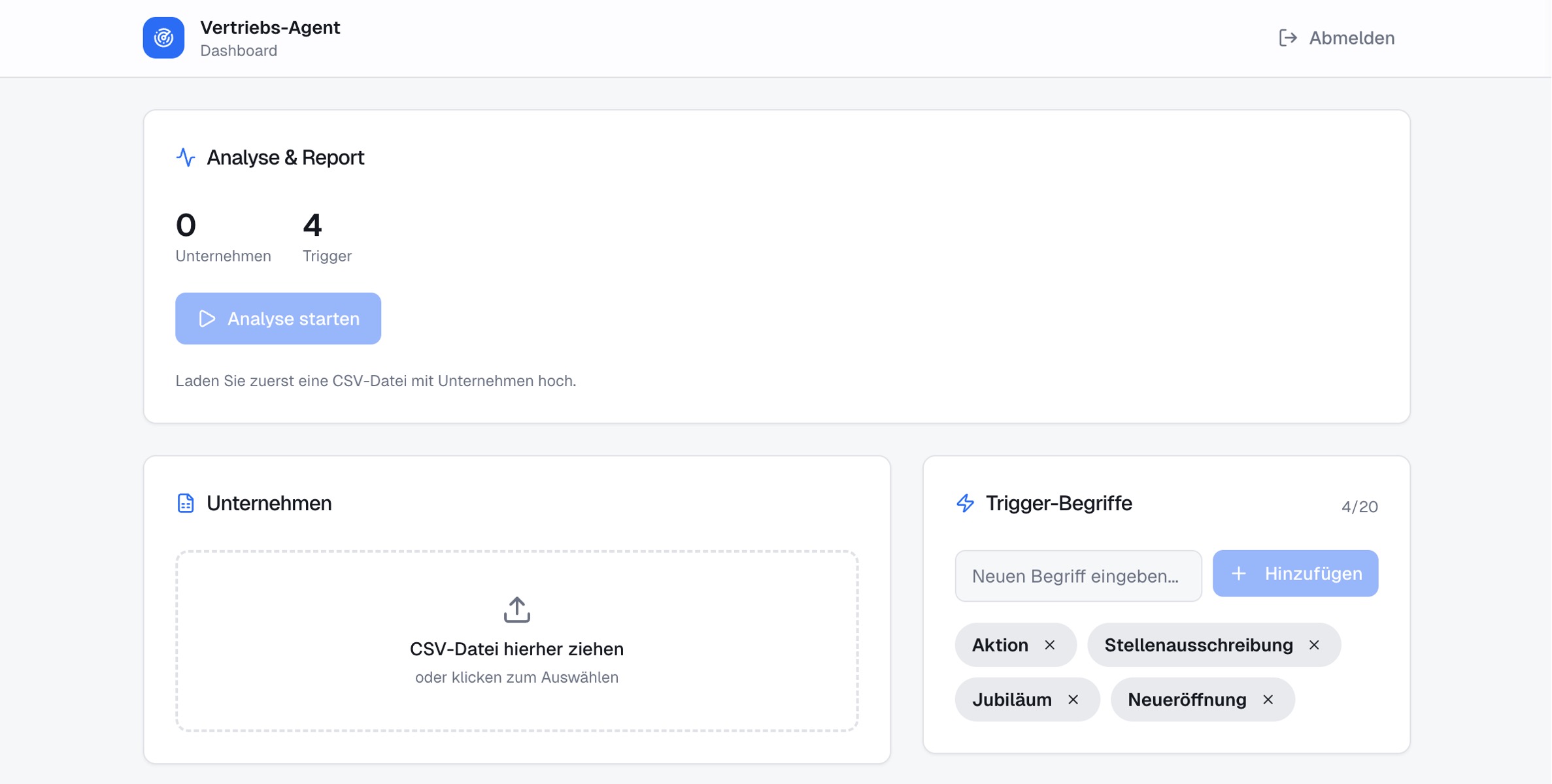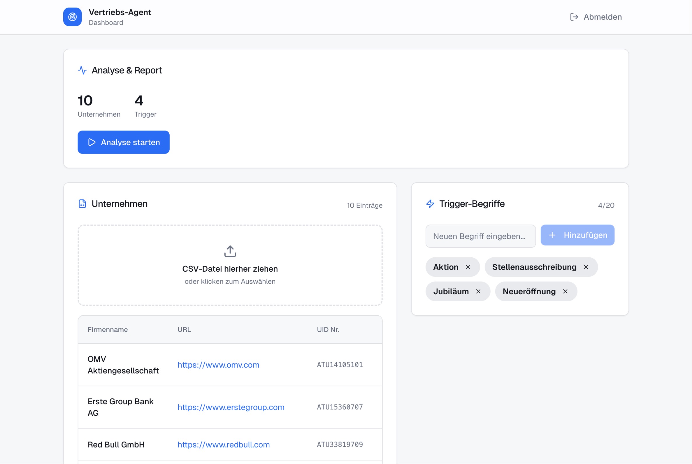 Die Analyse erfolgt in festgelegten Intervallen oder bei Bedarf manuell. Alle erkannten Signale werden in einem strukturierten Bericht zusammengeführt, der als Grundlage für gezielte Vertriebsaktivitäten dient.